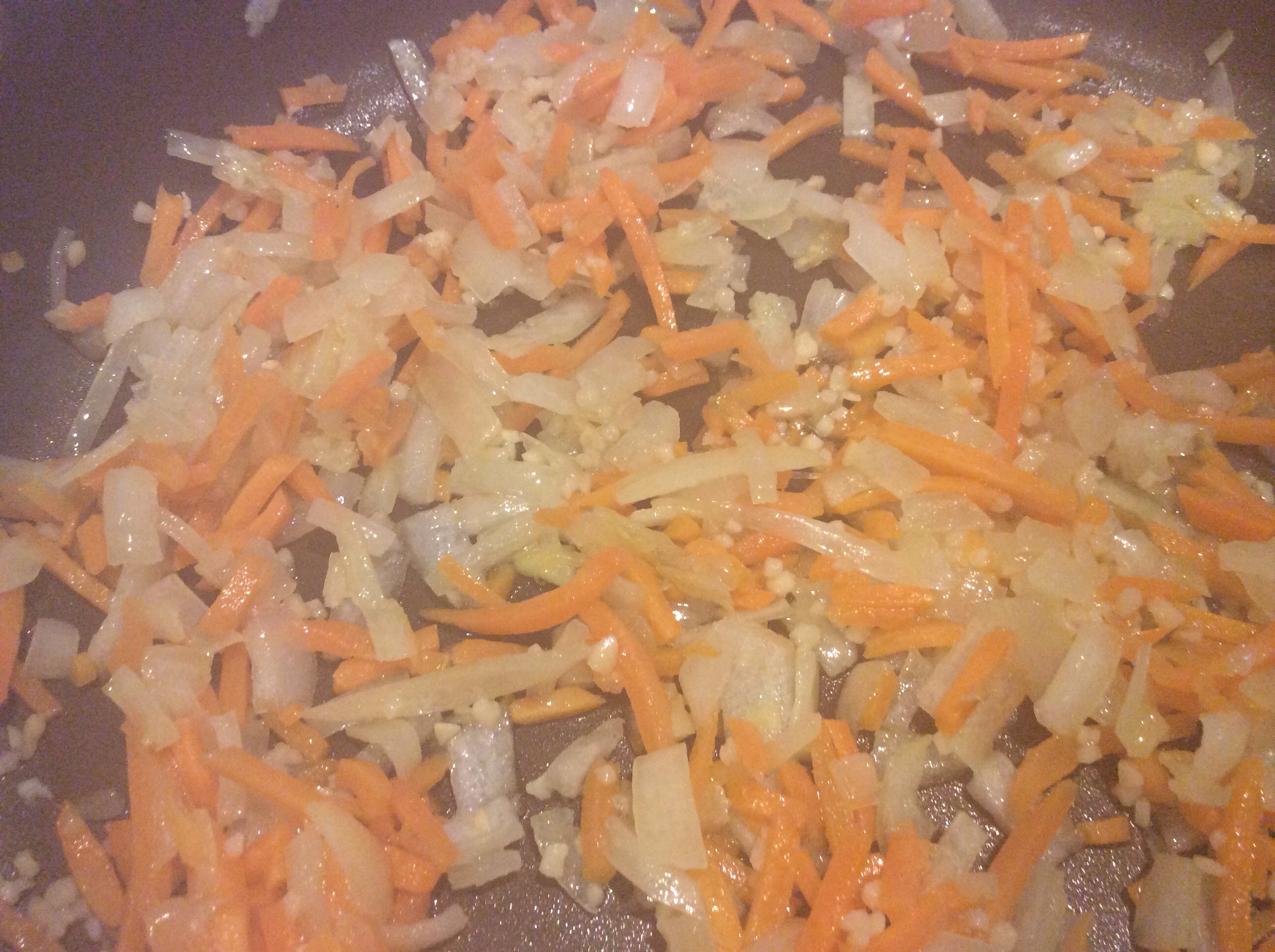 Preheat the oven to 35o degrees. In a large saucepan, heat the olive oil. Add onions and saute on low for about 15-2o minutes or until tender. Add carrots and garlic and saute an additional 10-15 minutes.