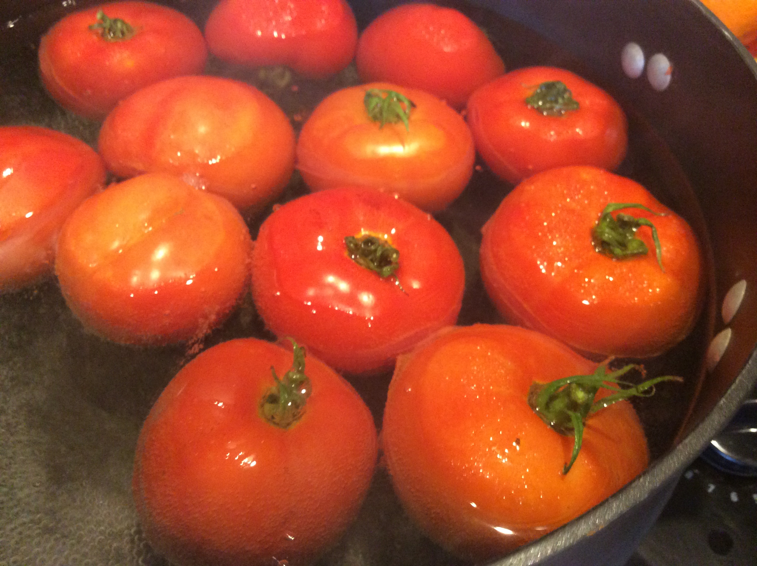 When canning any type of tomato recipe, you must remove the tomato skins because when heated from the processing step, the skins will fall off. It’s not a great textural taste to get a bite of slimy tomato skin! But removing the skins is soooo easy! First, place your tomatoes in a large pot of “gentle” boiling water. Leave them in for about a minute (or until you see the skin loosening).