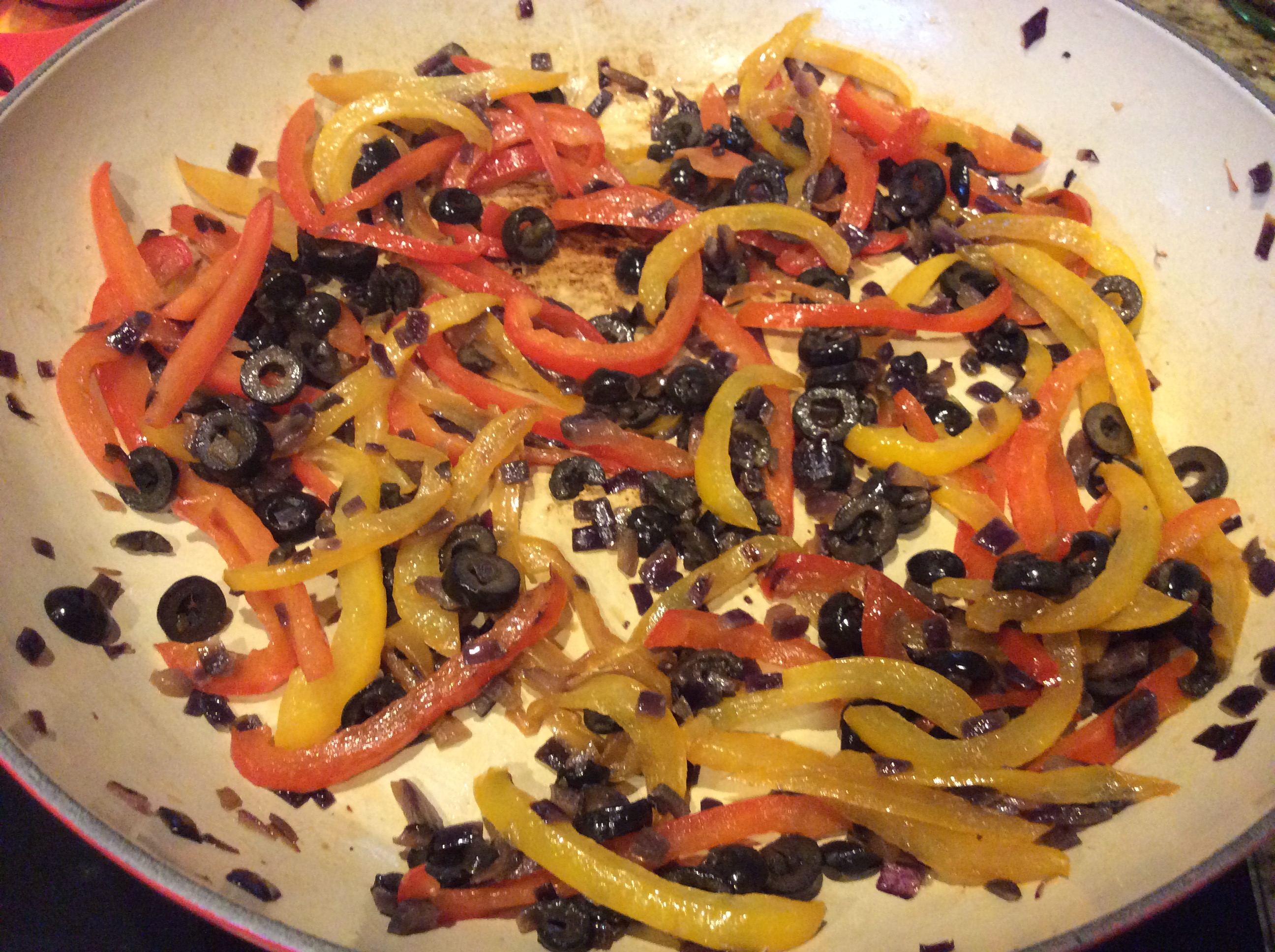 In a heavy skillet, heat 2 tablespoons of the Olive Oil over high heat until smoking. Add the Bell Peppers, Onions, Olives, and Red Pepper Flakes and cook, without stirring, for about 5 minutes or until the Peppers and Onions are slightly charred. Stir a couple of times and then cook for 5 minutes more.
