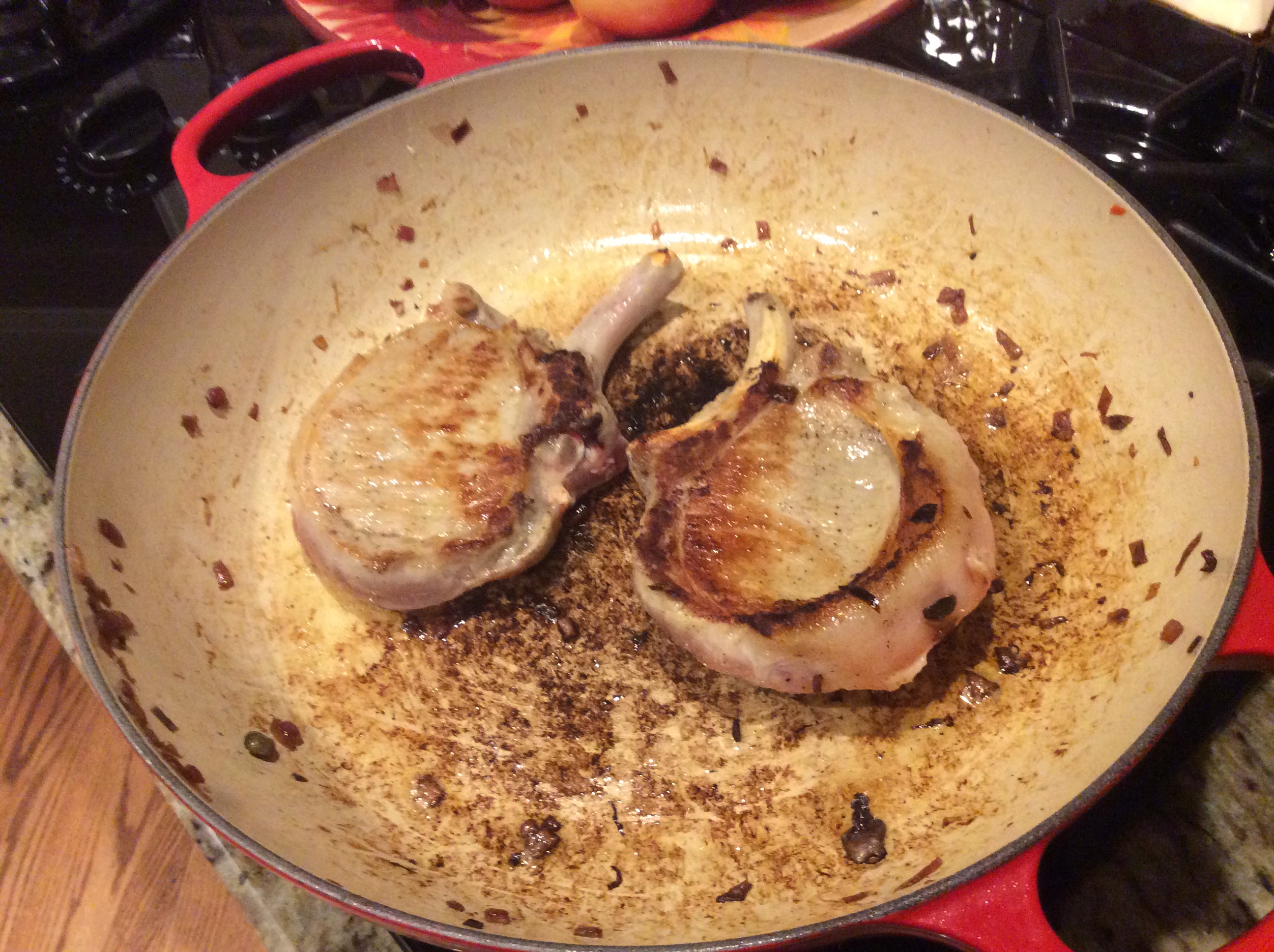 The brine seemed so much to me even cut down for 2 servings but I went with it exactly as written. Batali used a cast iron skillet on the show but I decided I wanted to do this in all one pan so I used one of my favorite pans…My Le Crueset Braising Pan. (It will be featured in “A Few of My Favorite Things” coming soon!) I knew the Braising Pan would be more successful for my vegetables and since this pan was made out of enameled cast iron, I felt like I could get a good sear on my chops.