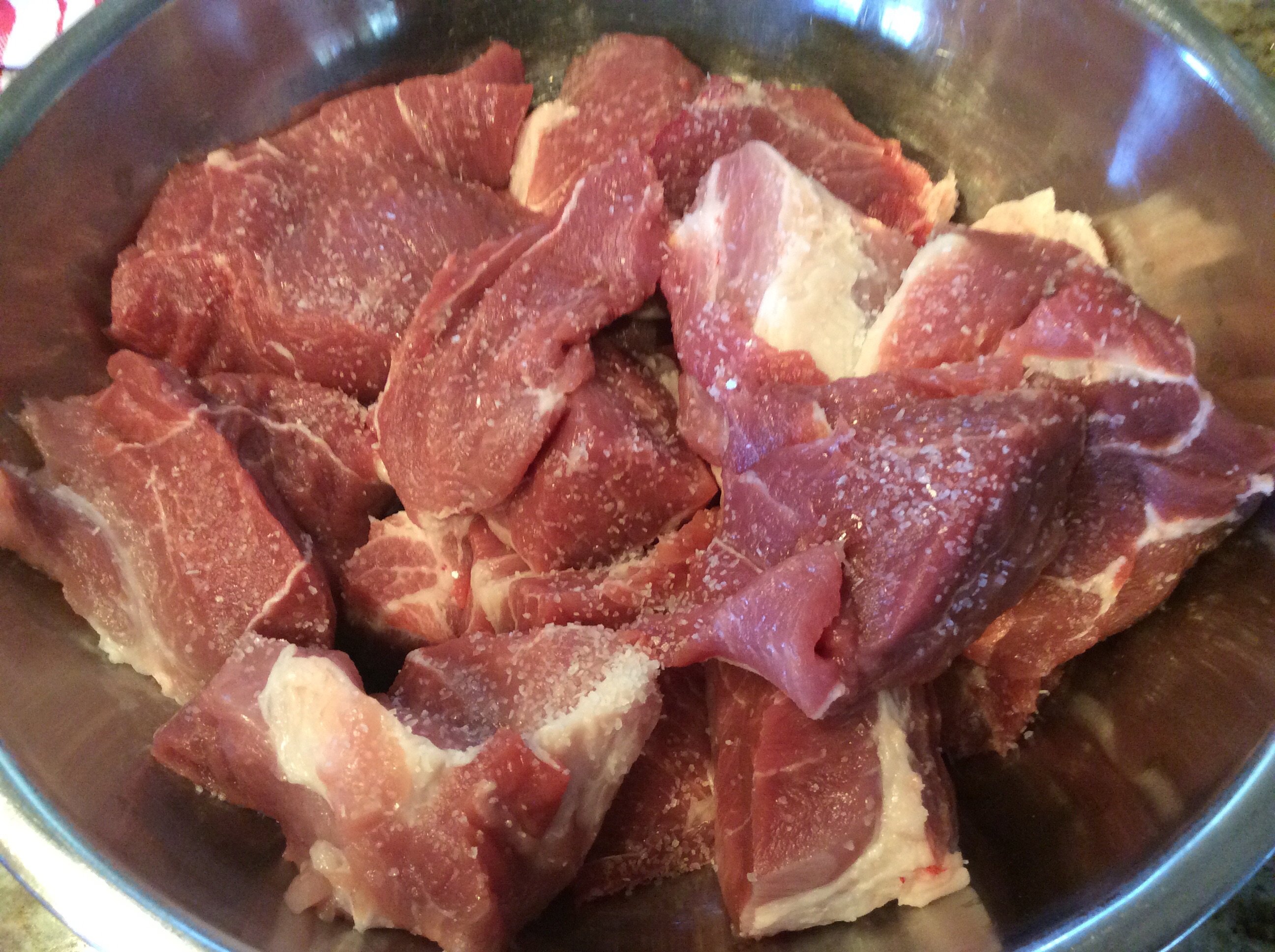 Cut the meat into 4 – 5″ chunks, removing any excess fat. Season all sides well with Sea Salt. (I used about 1 1/2 tablespoons).