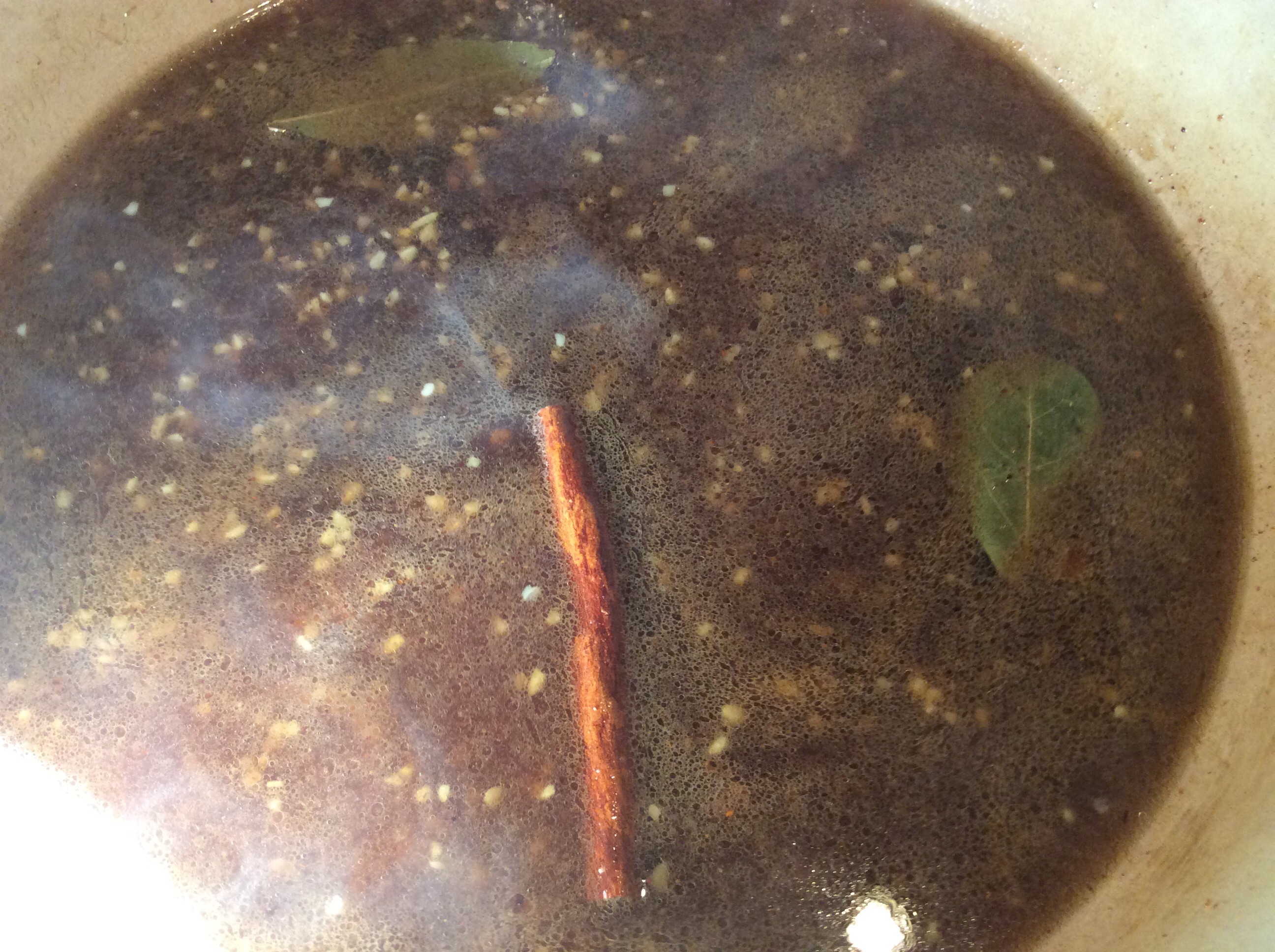 Add the cinnamon stick, bay leaves, garlic, both chili powders, and cumin. Mix well.