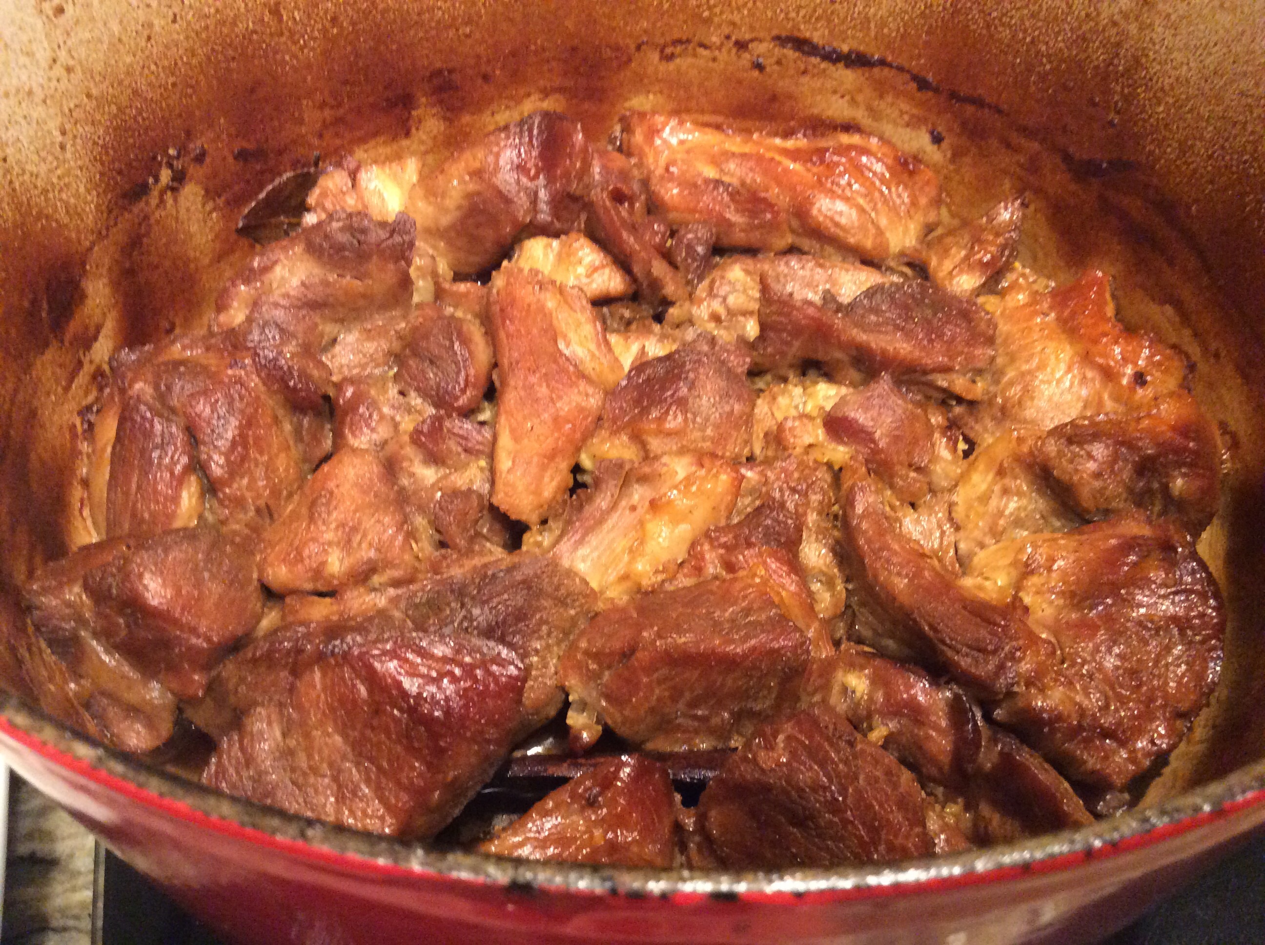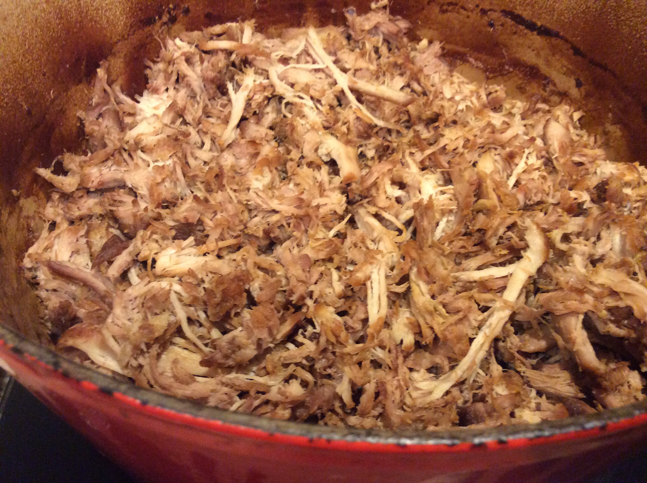When the meat is cool enough to handle, shred it and put it back into the pot. Add the liquid and stirl well. Cook until much of the liquid has evaporated and the outer edges of the pork becomes caramelized and crispy.