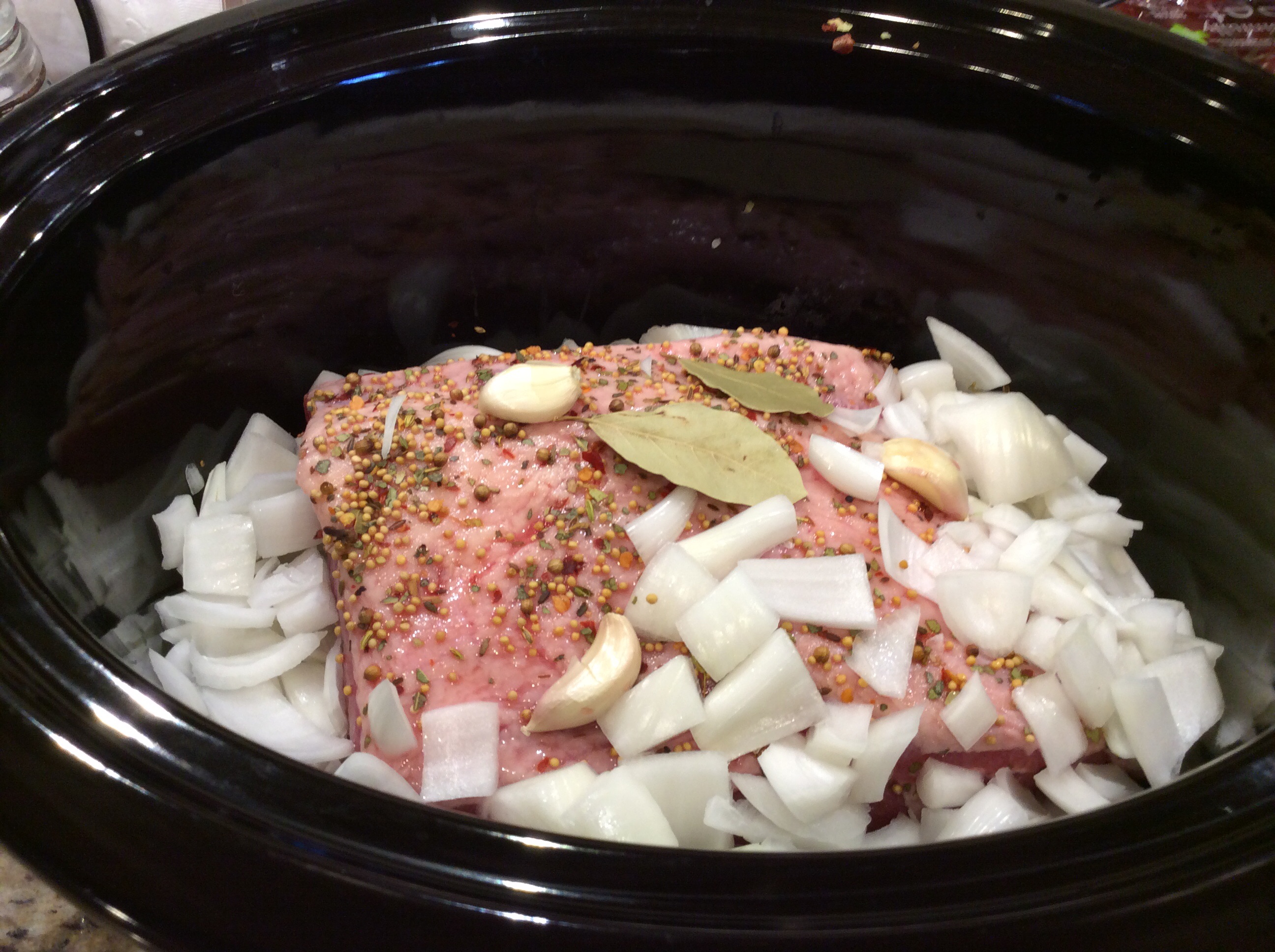 Place corned beef brisket, fat side up, into crock pot; sprinkle with pickling spice.  Add onions, garlic, bay leaves and cloves.image