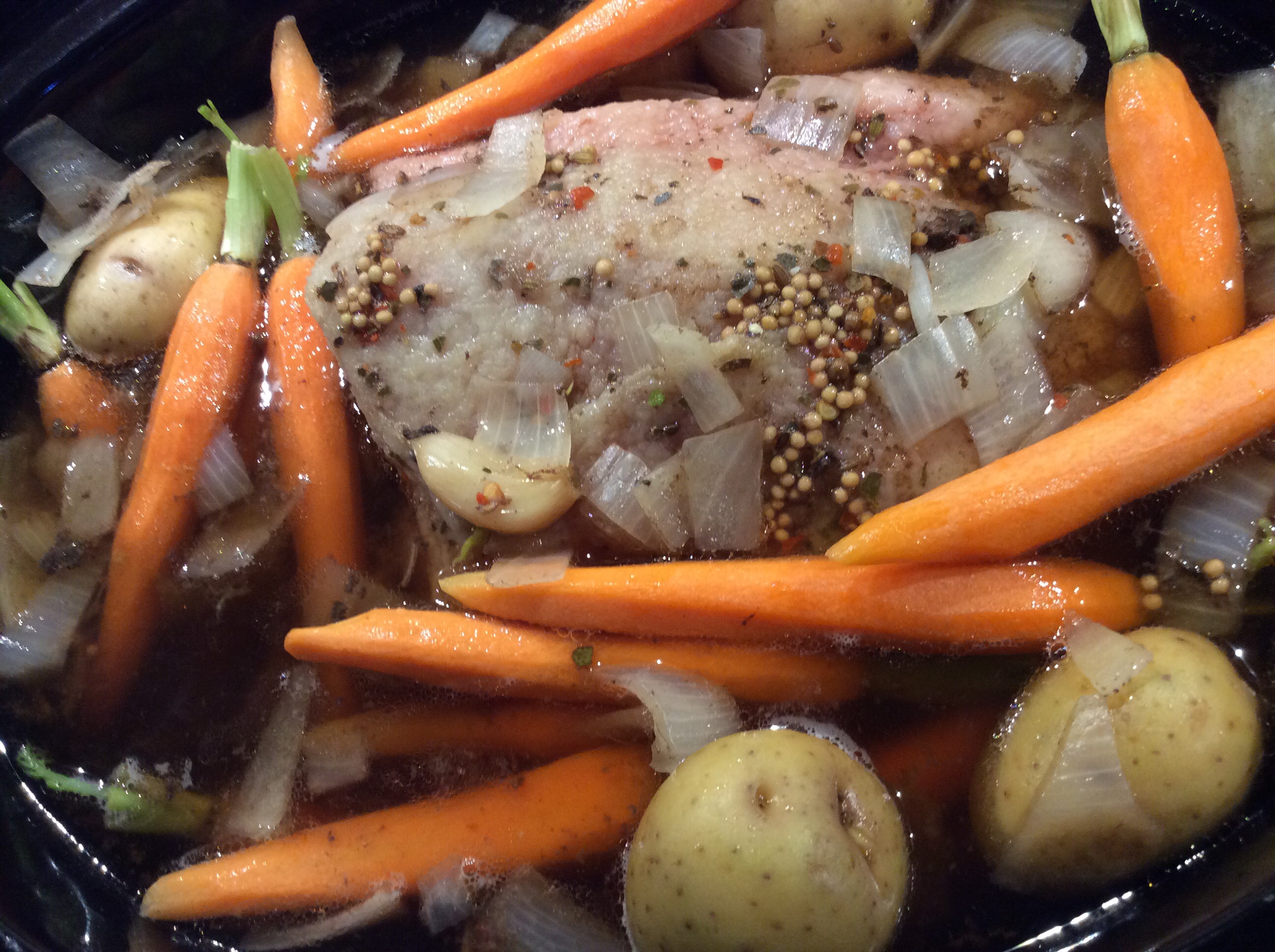 Remove corned beef and let rest for 5 minutes.  Thinly slice the corned beef against the grain and place it back in the dish with the carrots and potatoes.IMG_3906
