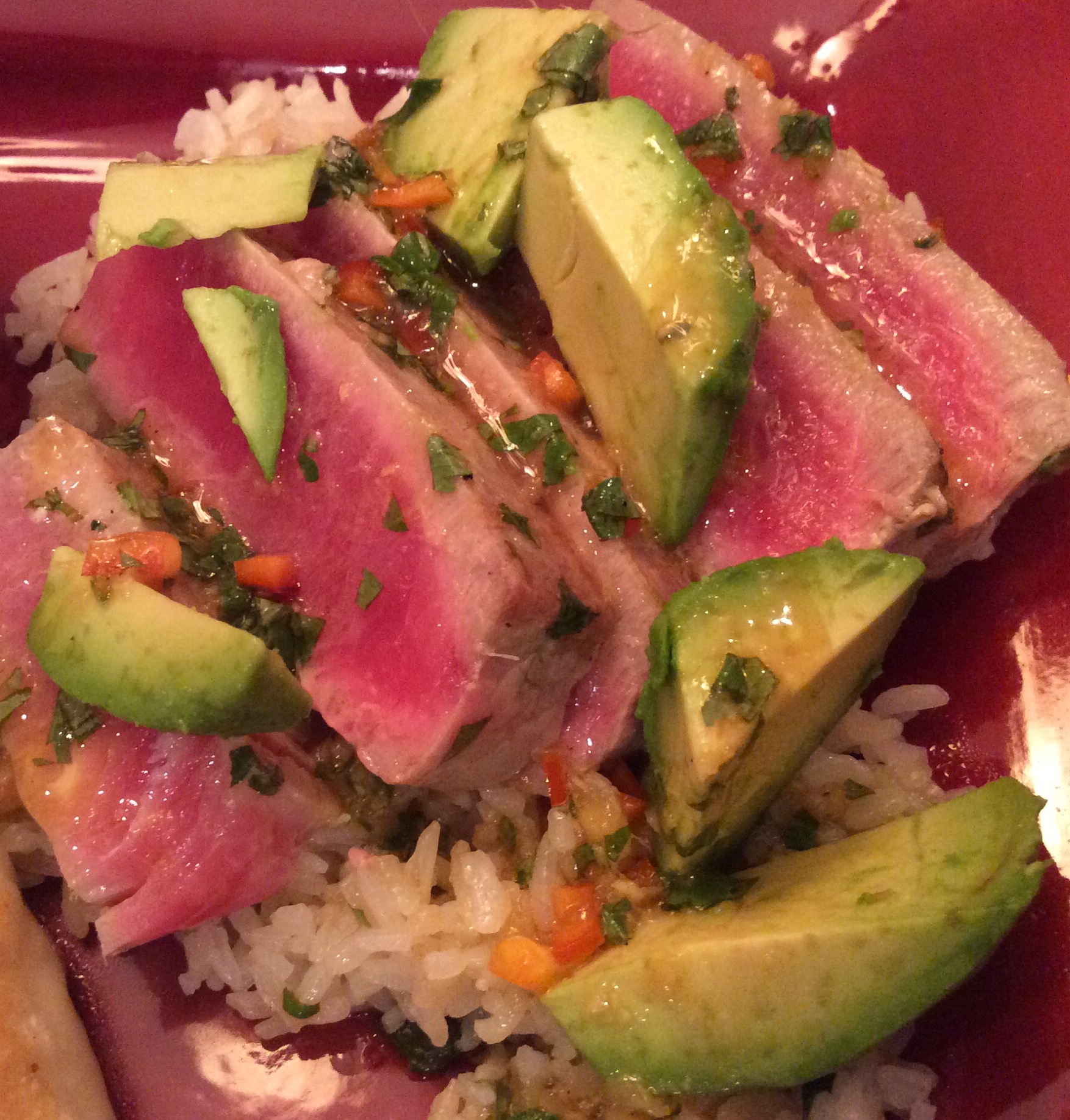 A perfectly seared tuna over rice with a tasty sauce…so yummy!