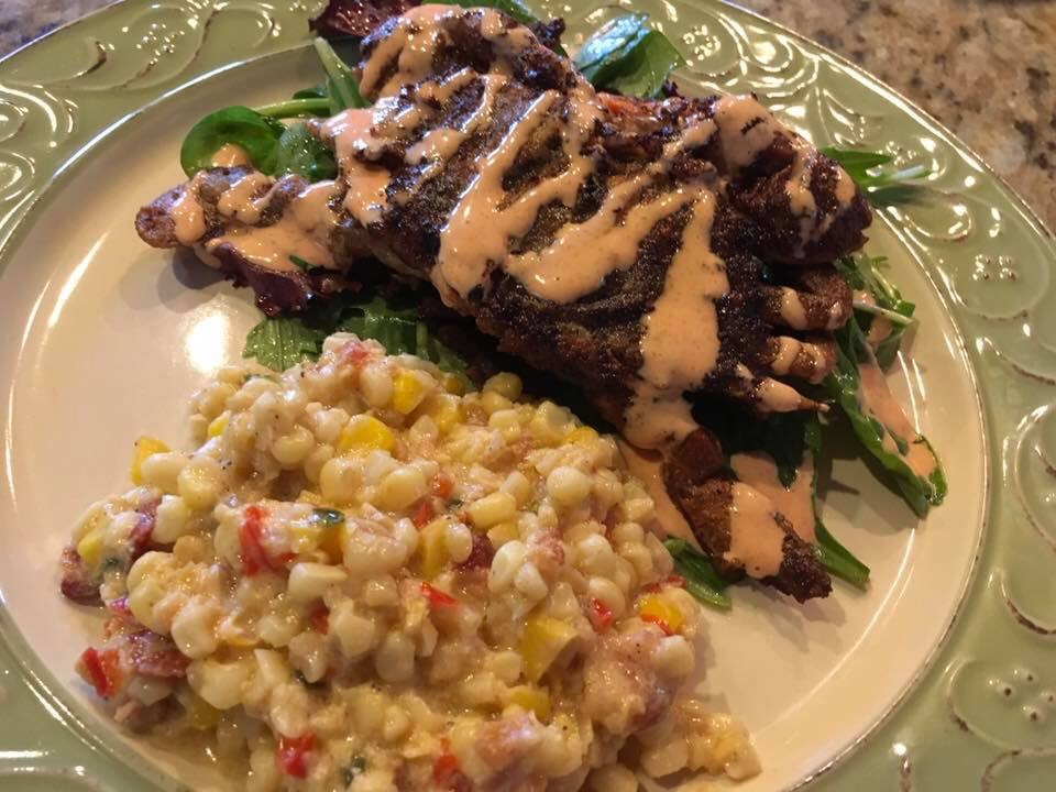 Last week, Jeff made my all-time favorite summer guilty pleasure…Fried Soft Shell Crab and Fried Corn. (Yes, you did see the word “Fried” twice and that is why in bathing suit season, the words “guilty pleasure” fits perfectly..!) To make it even more indulgent, I made a Sirracha Aioli to top the crab and a bed of mixed greens…so very good!
