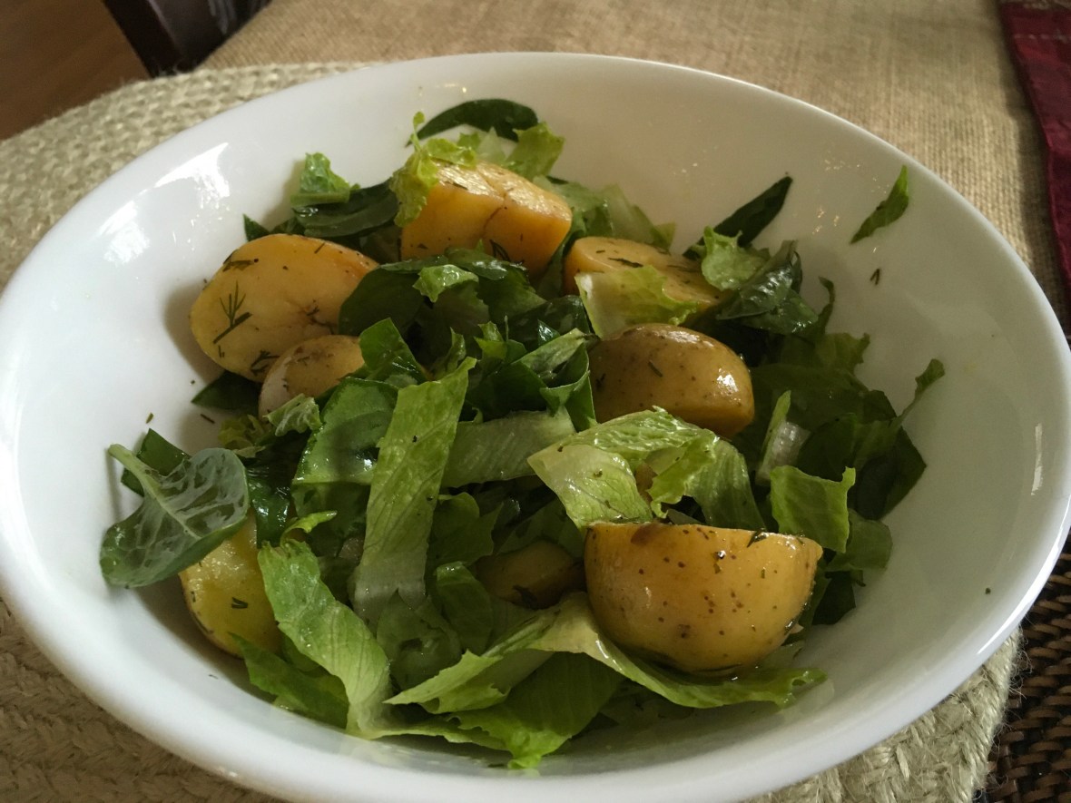 I had some Ikarian Winter Potato Salad from last night so I set the potatoes removed them from the fridge and let out so they could come to room temperature. Next, I tossed my salad with the leftover dressing. I mixed it all together about 20 minutes later.