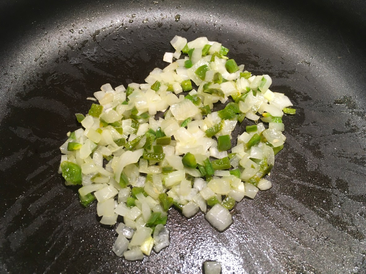 Heat olive oil in a medium skillet and sauté onions and jalapeño on low for about 5 minutes.