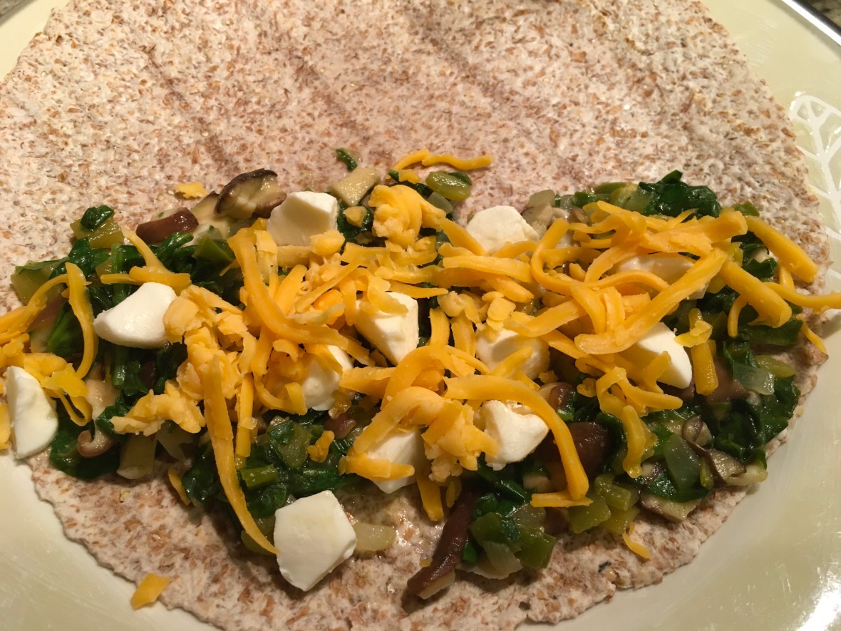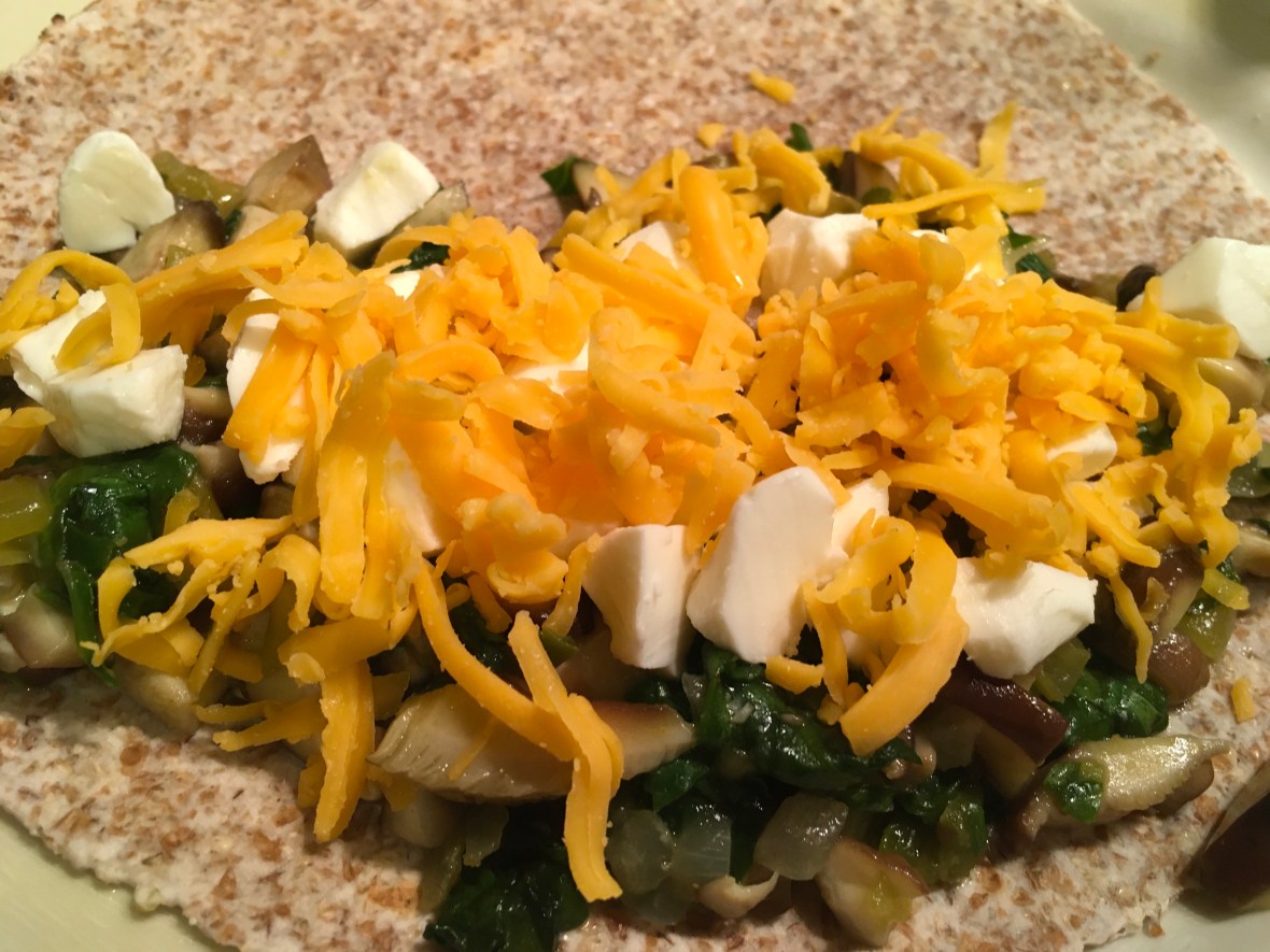 On a tortilla, spread 1/4 of the mixture on one side of the tortilla. Top with some of the mozzarella and cheddar.