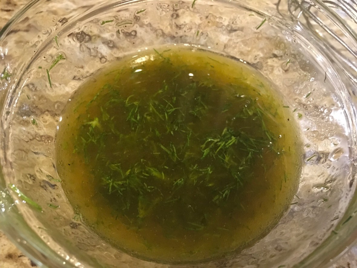 - In a small bowl, combine dill, olive oil, and vinegar; season with salt and pepper to taste. Whisk until well combined.