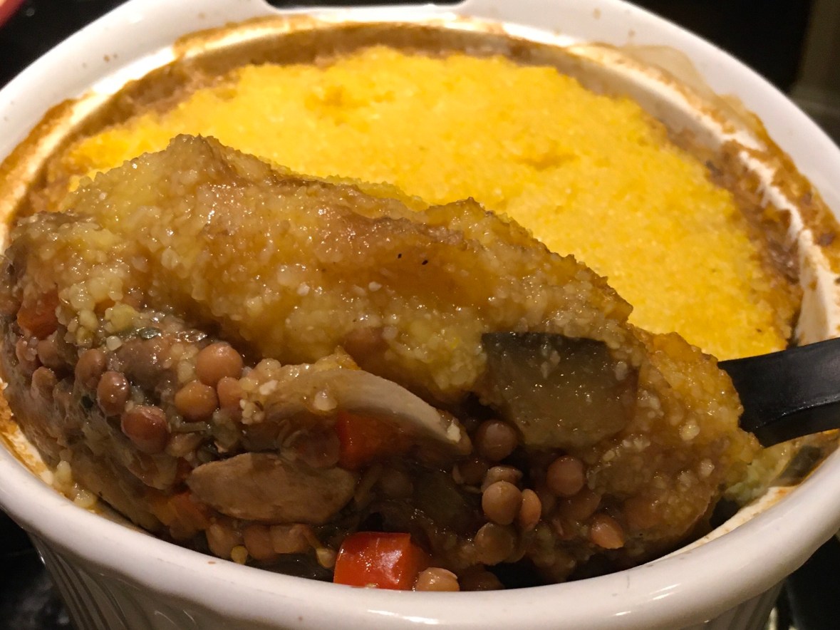 So, “Shepherd’s Pie” is a very loose term for today’s recipe but the way it is layered seemed a little similar to that of the traditional version. Instead of lamb, my base is primarily eggplant and lentils. Then, I used polenta, which is stone ground corn kernels similar to grits, to replace the mashed potatoes. While not your meaty original, it was extremely “comforting and satisfying!