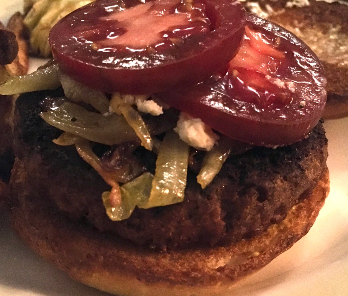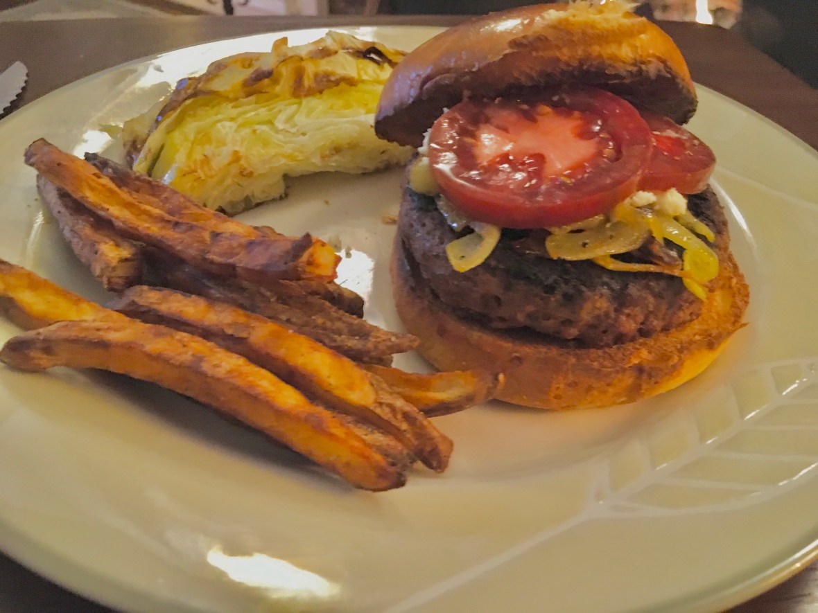 On New Year’s Eve, the day before we started our new eating lifestyle, Jeff asked me what I wanted as “last meat meal” for a while. My request? Steak…no. Fried Chicken…no. Not even Ribs! All I wanted was a burger and he gave me a great one filled with yummy horseradish on the inside. It was fantastic!
