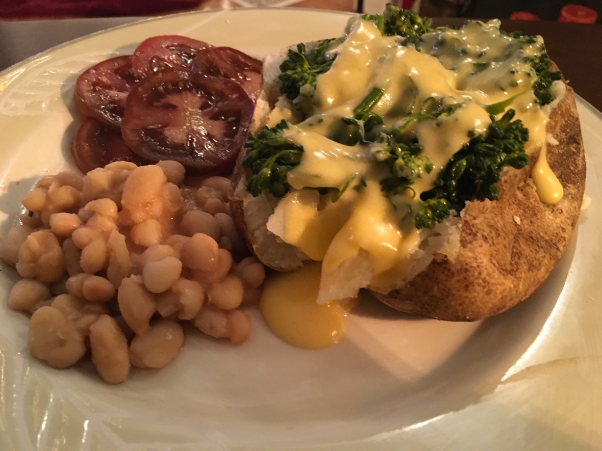With that being said, most of today was being spent waiting to go for my yearly physical exam which means that if you have a 1 pm appointment, then there isn’t a lot of eating going on since you have to fast. So, all I have for you today is my super easy dinner and Boy, did I make it simple with a baked potato stuffed with broccolini!