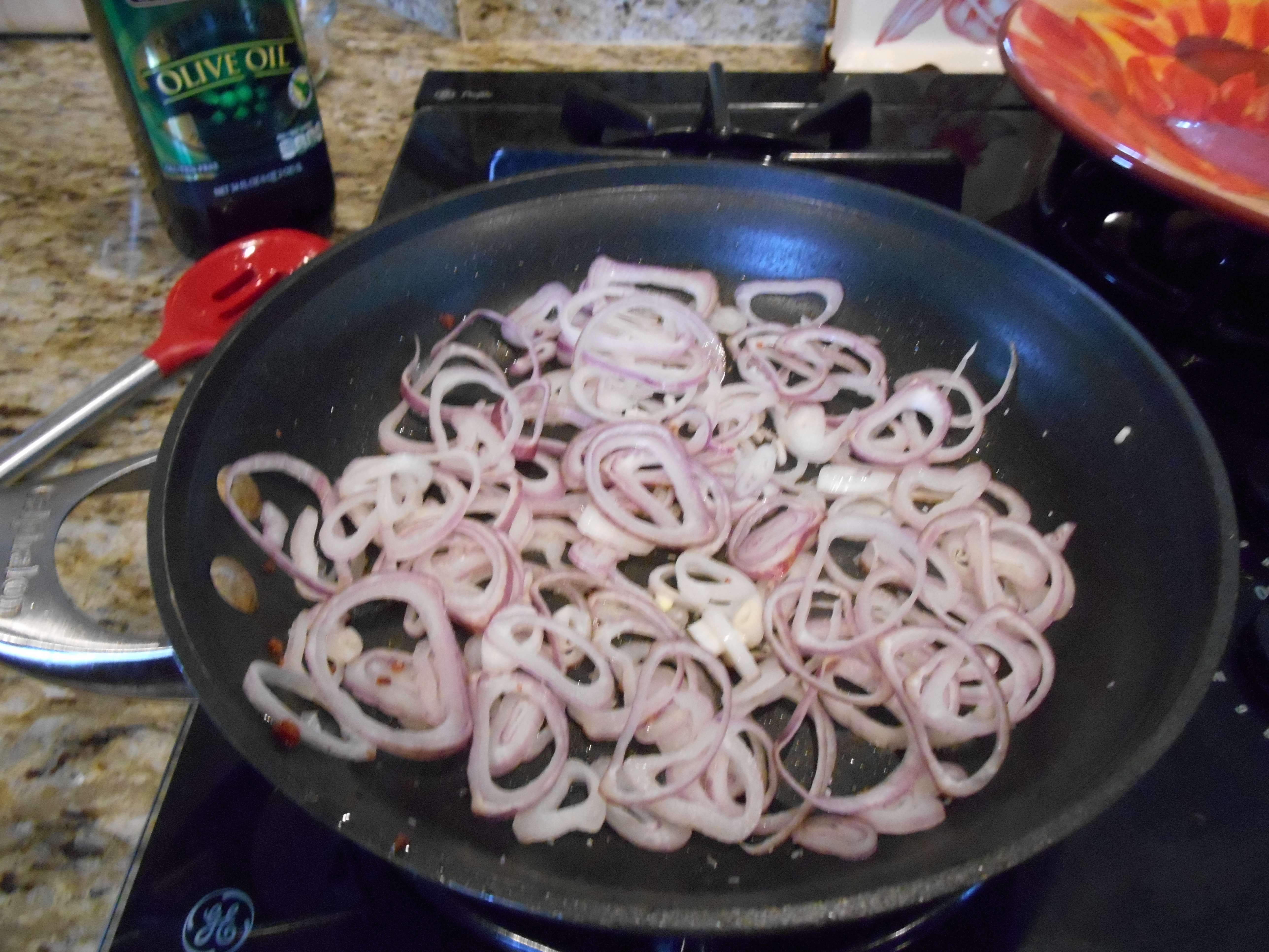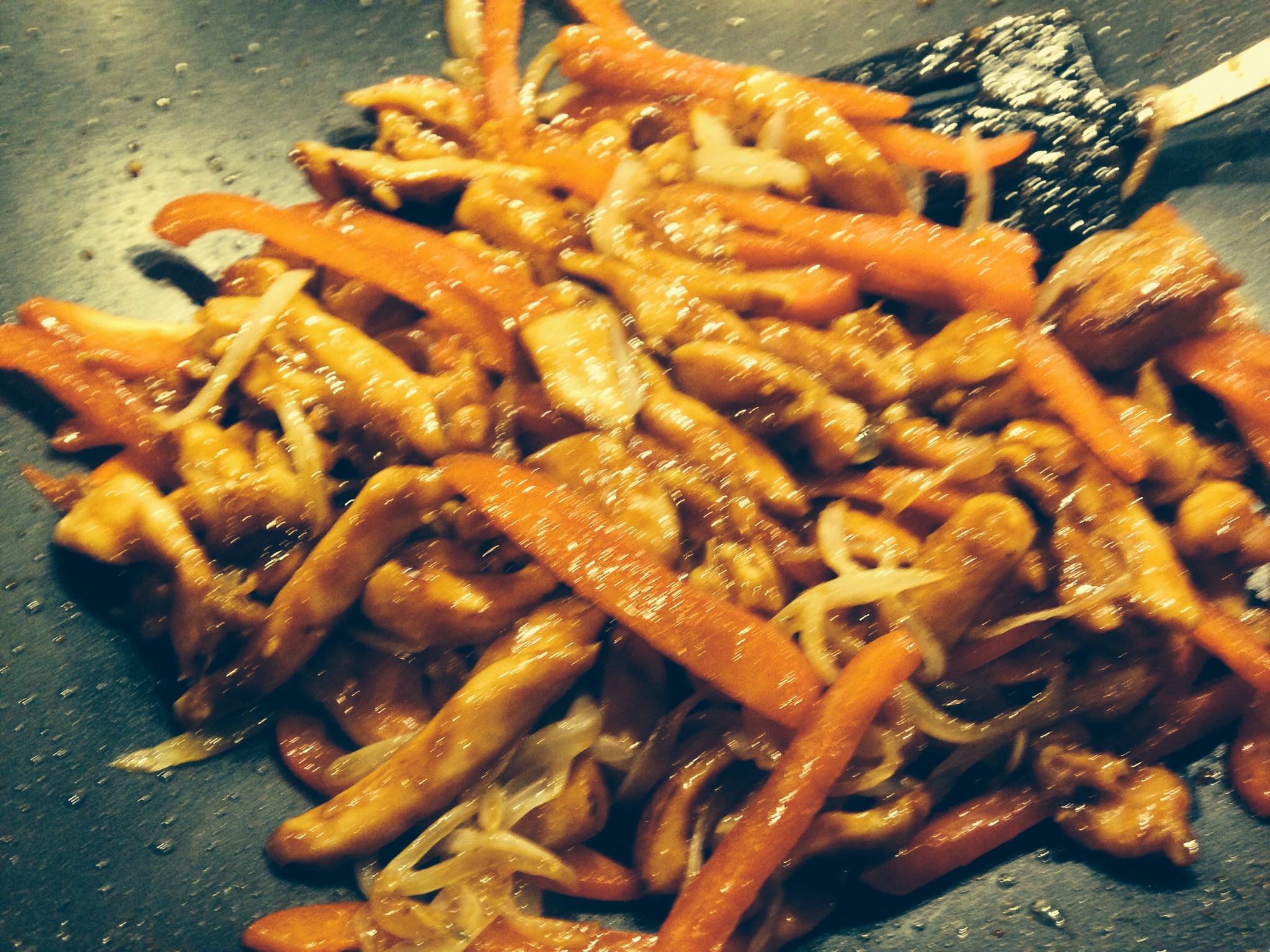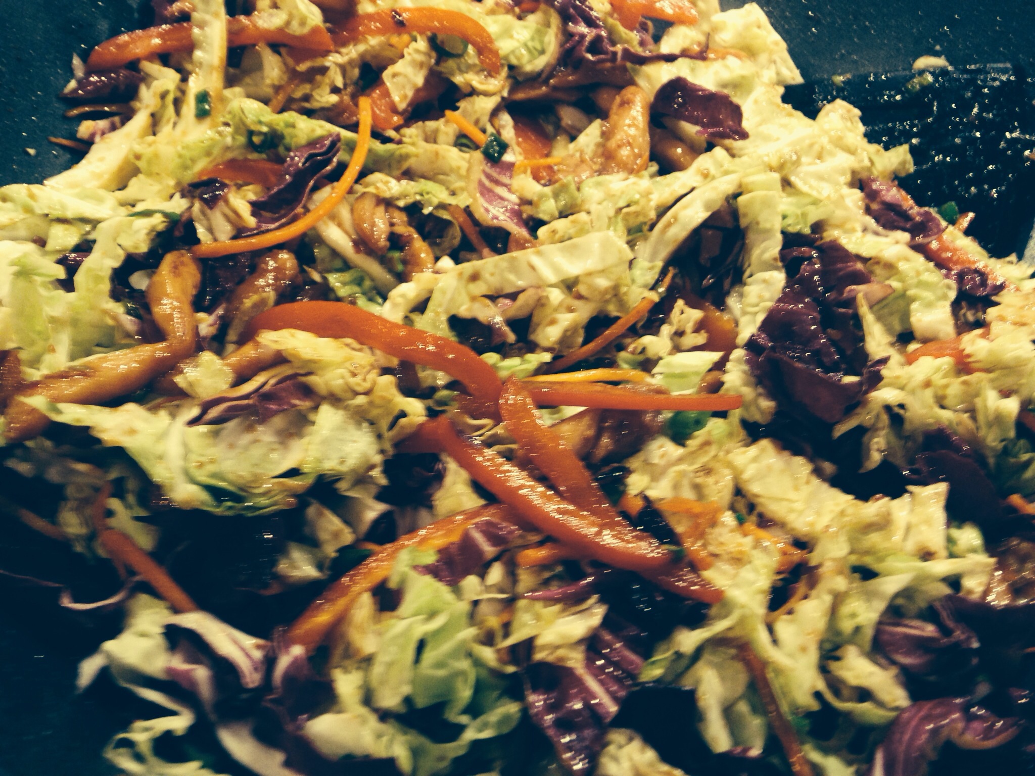 Once 5 minutes of marinating time remains, heat a large wok or skillet over high heat and add 2 tablespoons of the canola oil to heat. Using a slotted spoon, strain the chicken add to the very hot wok or skillet. Cook, allowing it to brown, stirring occasionally, about 2 minutes. (Note: I’m a stickler for having my onions cooked perfectly so I did this part a little differently. I sauteed my onions until slightly softened, removed them, added the chicken to the wok, and then followed the directions as stated.) Add the red bell pepper and the onion slices, allowing them to soften, another minute. Next, add the cabbages and carrots and cook, stirring occasionally, until just browning, about 2 minutes.