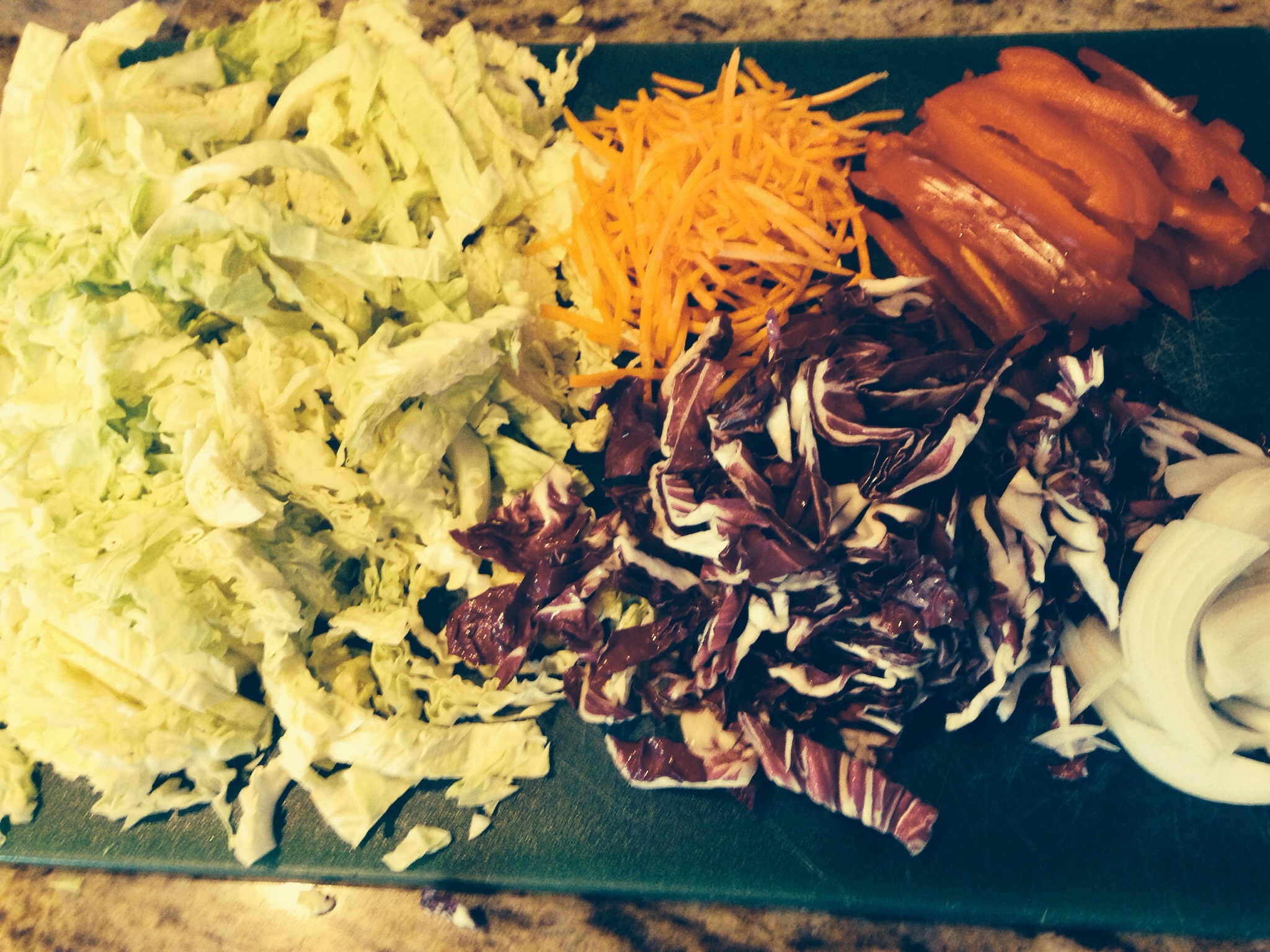 The only thing I don’t like about this recipe is the vegetable to chicken ratio. I used 1 1/2 lbs of chicken and even after I left out the green cabbage and only used the napa and red cabbages, I still have to much vegetable so either add more chicken or just do less vegetables. The recipe below is my new version. (Note: make your crepes first and keep warm while you prepare the Mu Shu Chicken)