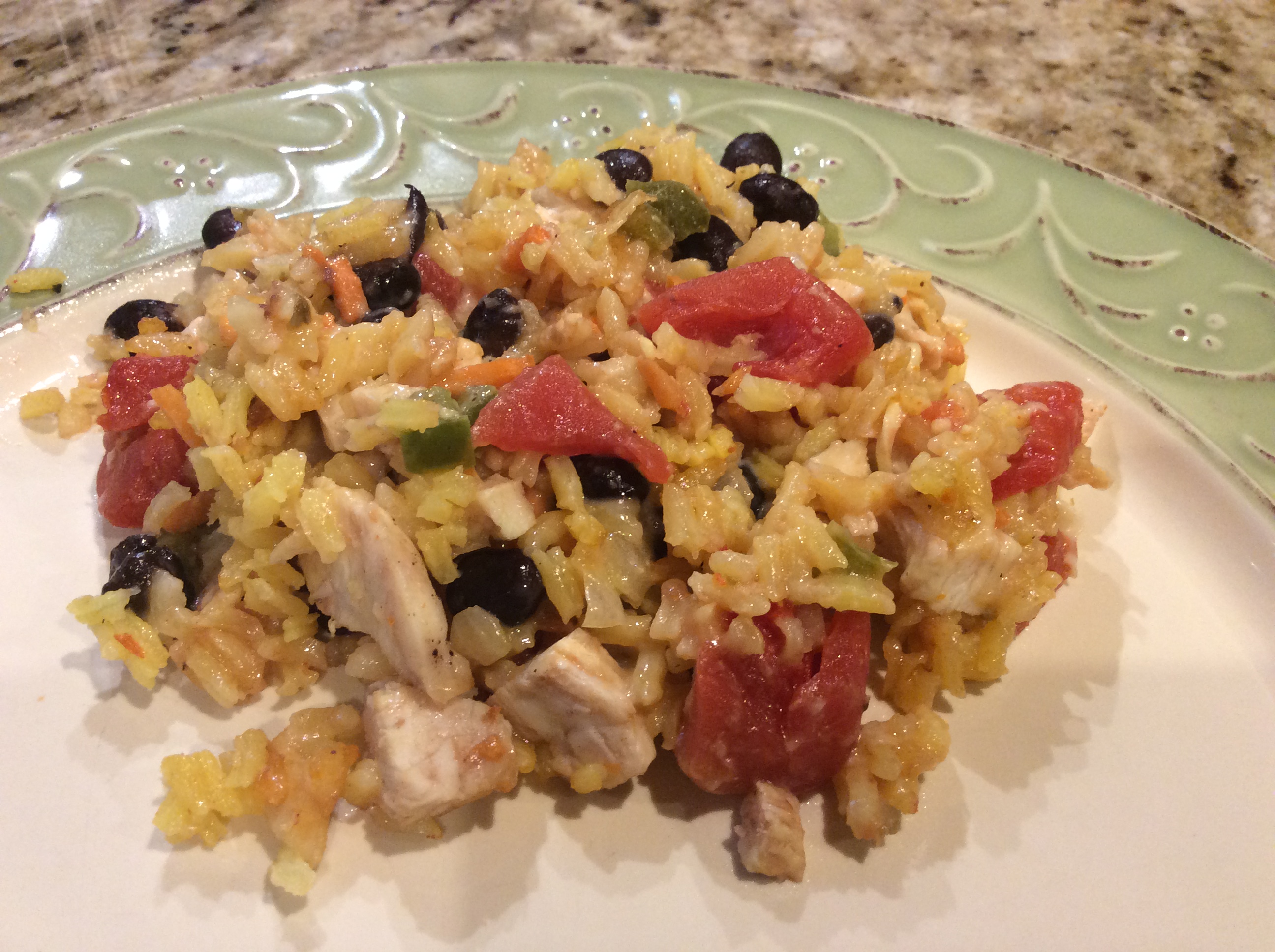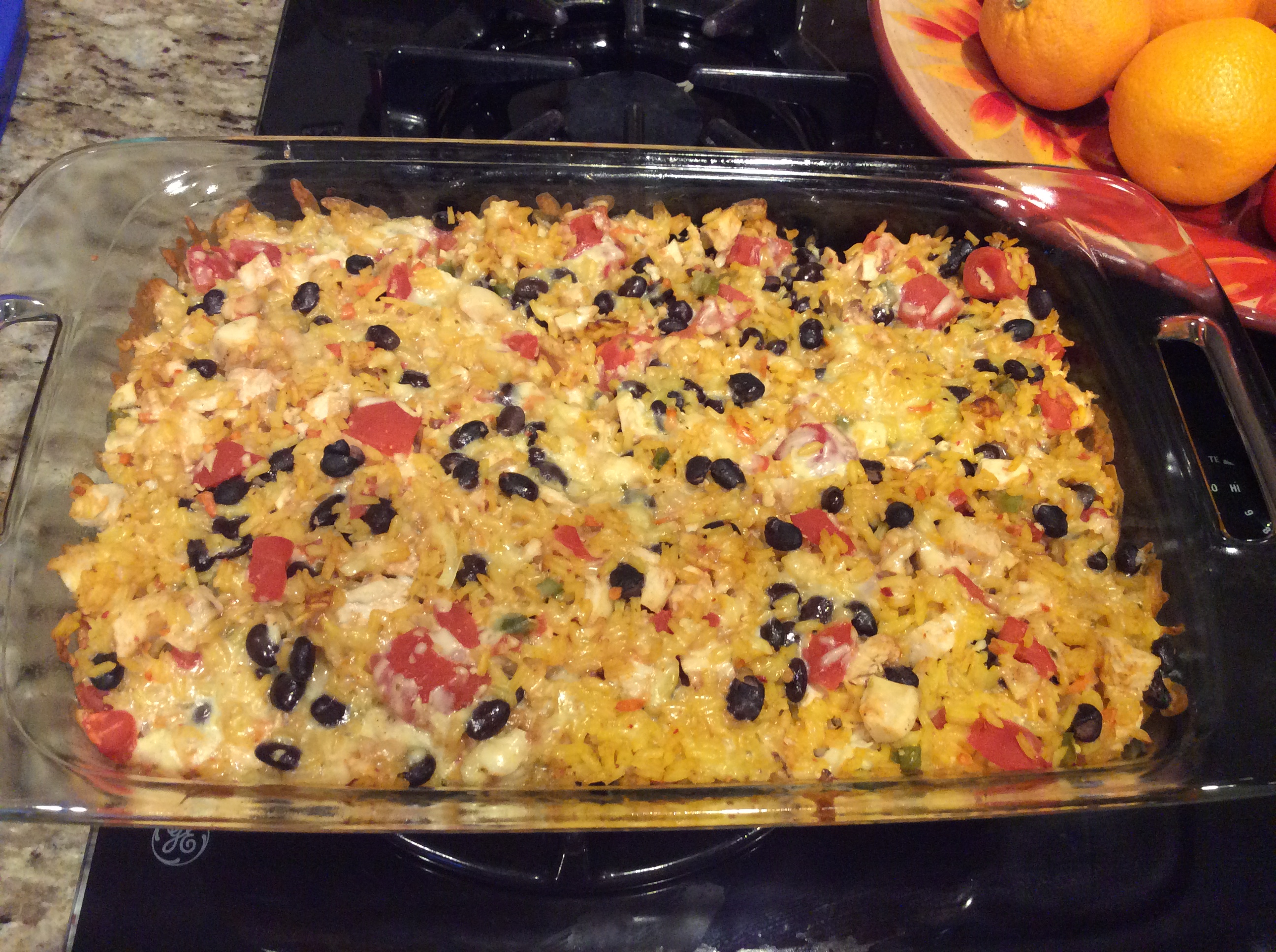 Preheat oven to 350 degrees. Prepare rice according to package directions. Meanwhile, saute’ onion, green pepper and carrot in hot oil in medium skillet over medium heat 10 minutes. Combine hot cooked rice, onion mixture, chicken, beans, diced tomatoes, 1 1/2 cups cheese in large bowl.